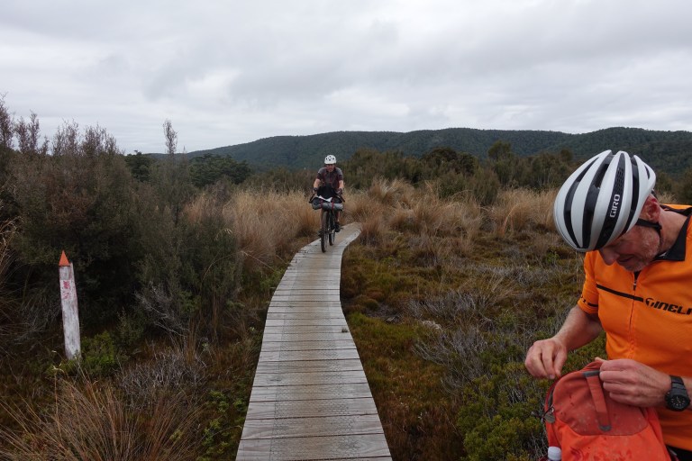 Steve and Hamish , stopping for a quick bite before hitting the more difficult section of Waiuta.